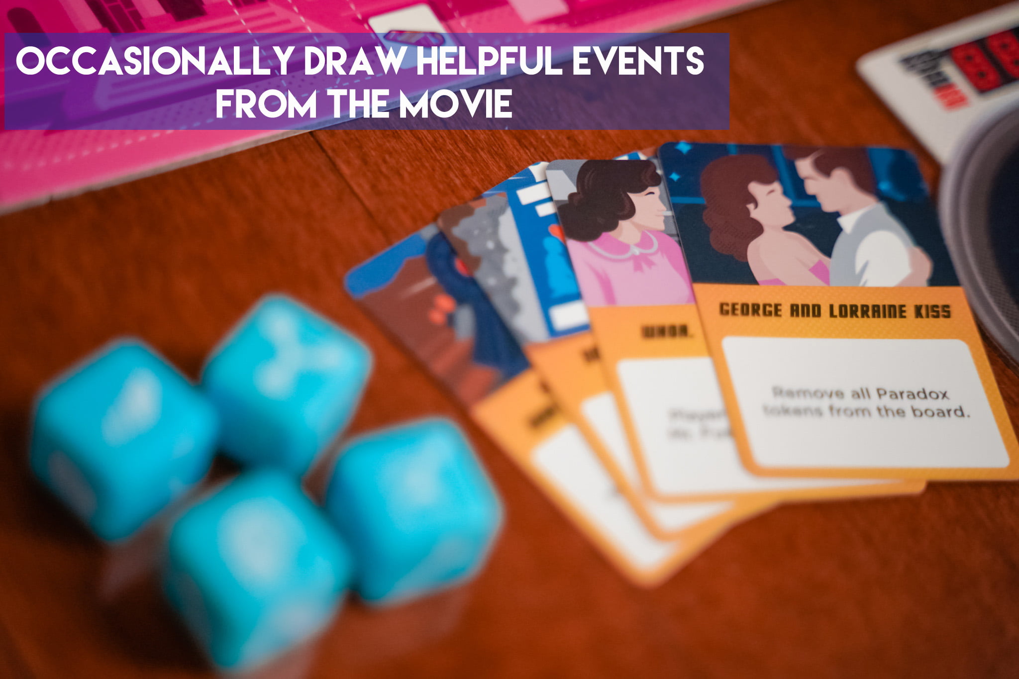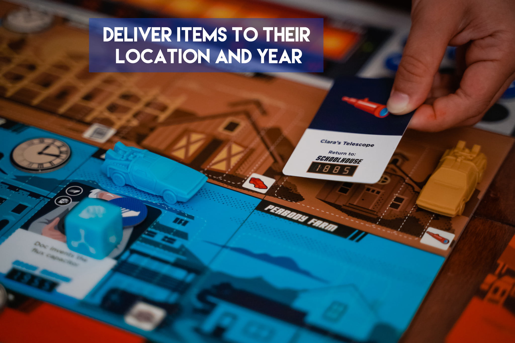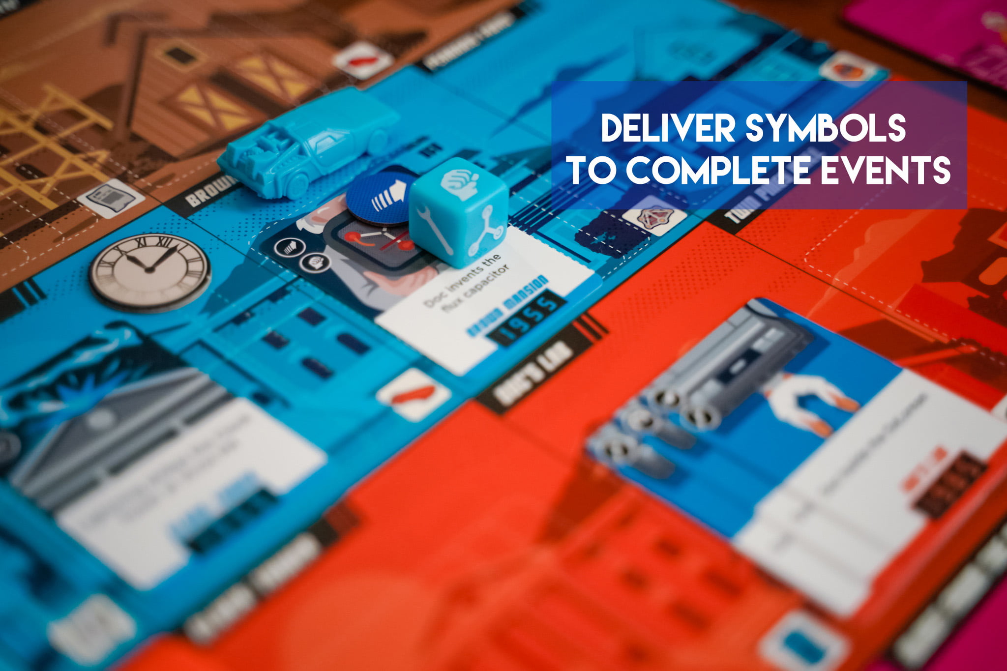 In Back to the Future: Dice Through Time you play cooperatively to return lost items (Hover Board, Guitar, etc) to their correct location and year before you are “outatime”. But first you have to find the items by dealing with some events from the trilogy of movies (ie. connect the wire at the clocktower before lightning strikes!).