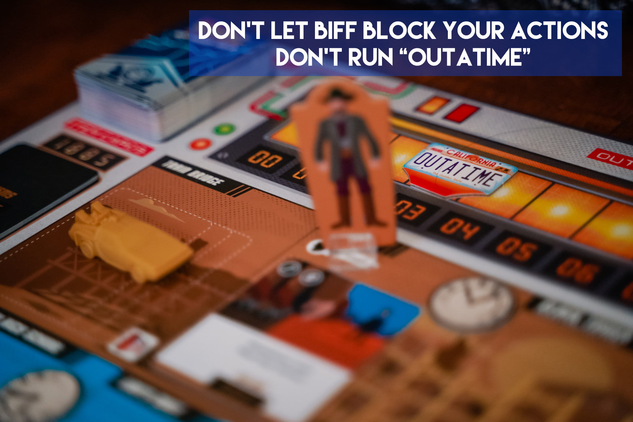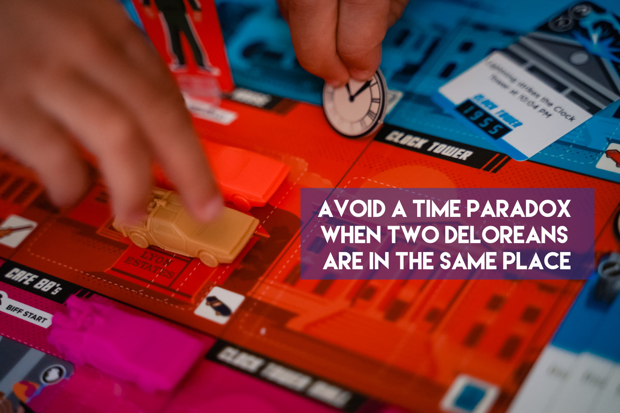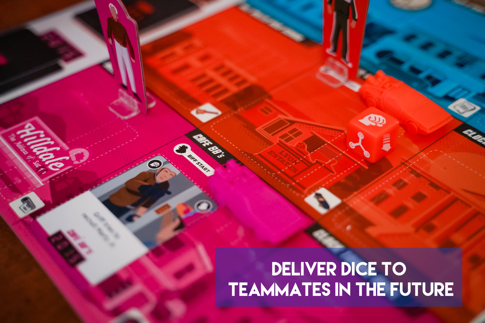 In Back to the Future: Dice Through Time you play cooperatively to return lost items (Hover Board, Guitar, etc) to their correct location and year before you are “outatime”. But first you have to find the items by dealing with some events from the trilogy of movies (ie. connect the wire at the clocktower before lightning strikes!).