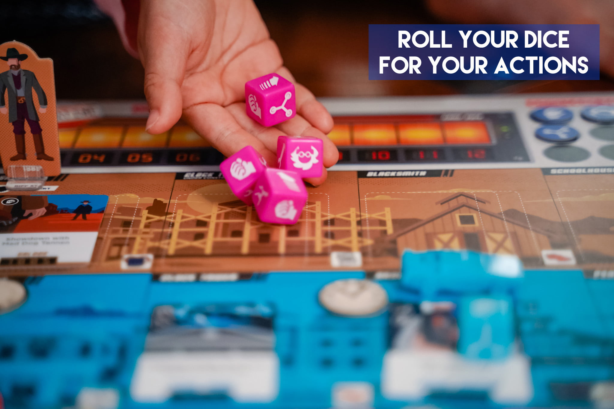 Each player has a set of dice and their own Delorean to move around the board to different locations in different years. The dice symbols dictate what actions you can do, such as move to another location, time travel to another year, punch Biff since he blocks locations, remove a time paradox (which can occur if two Deloreans are in the same spot).