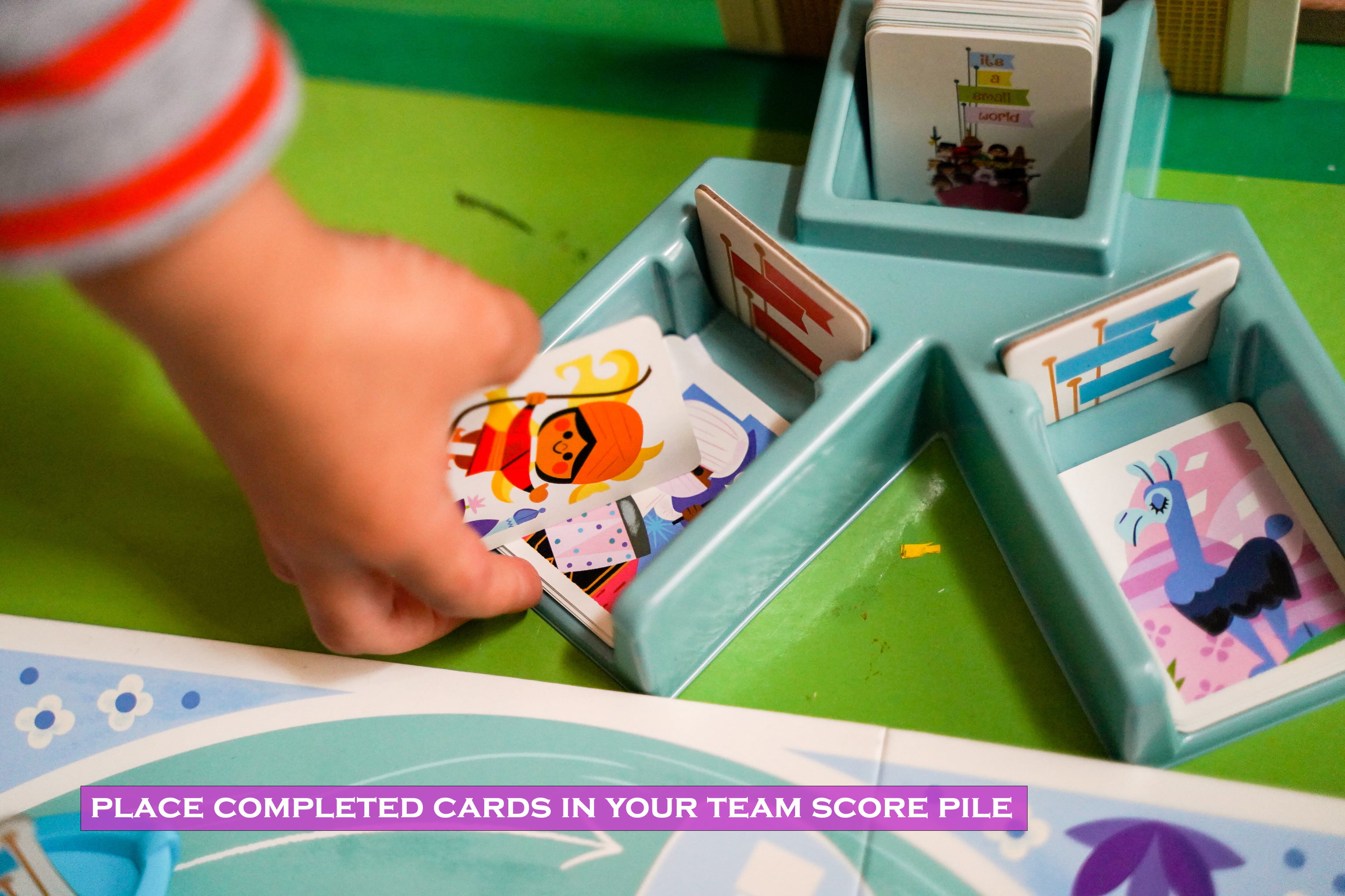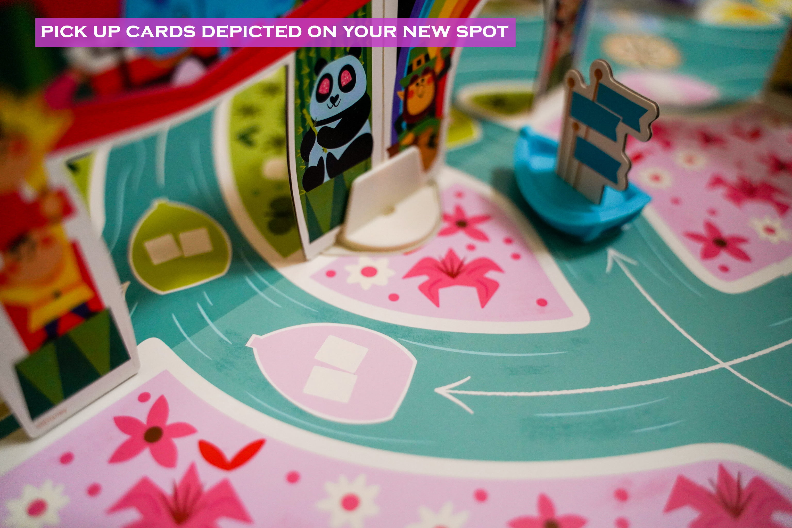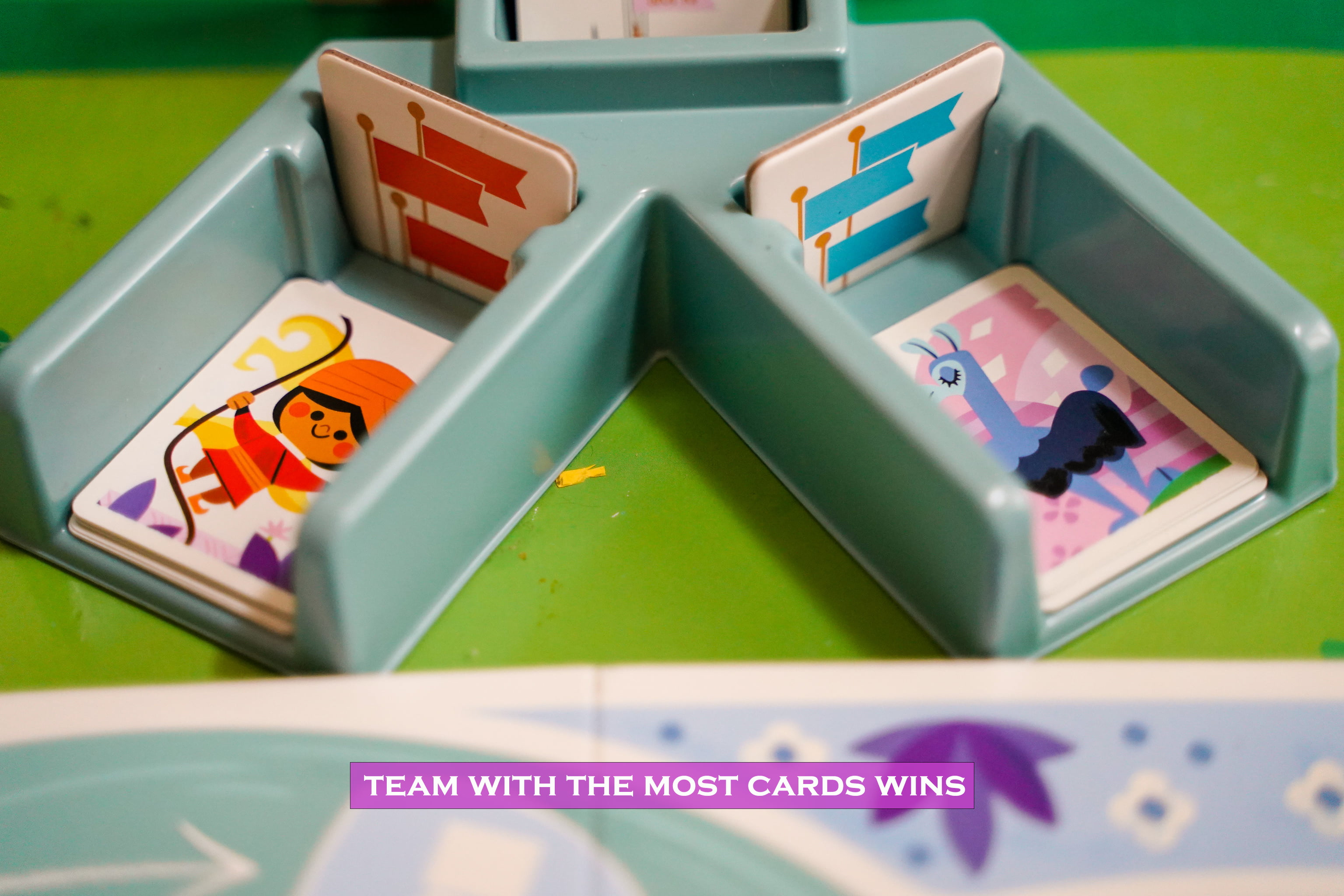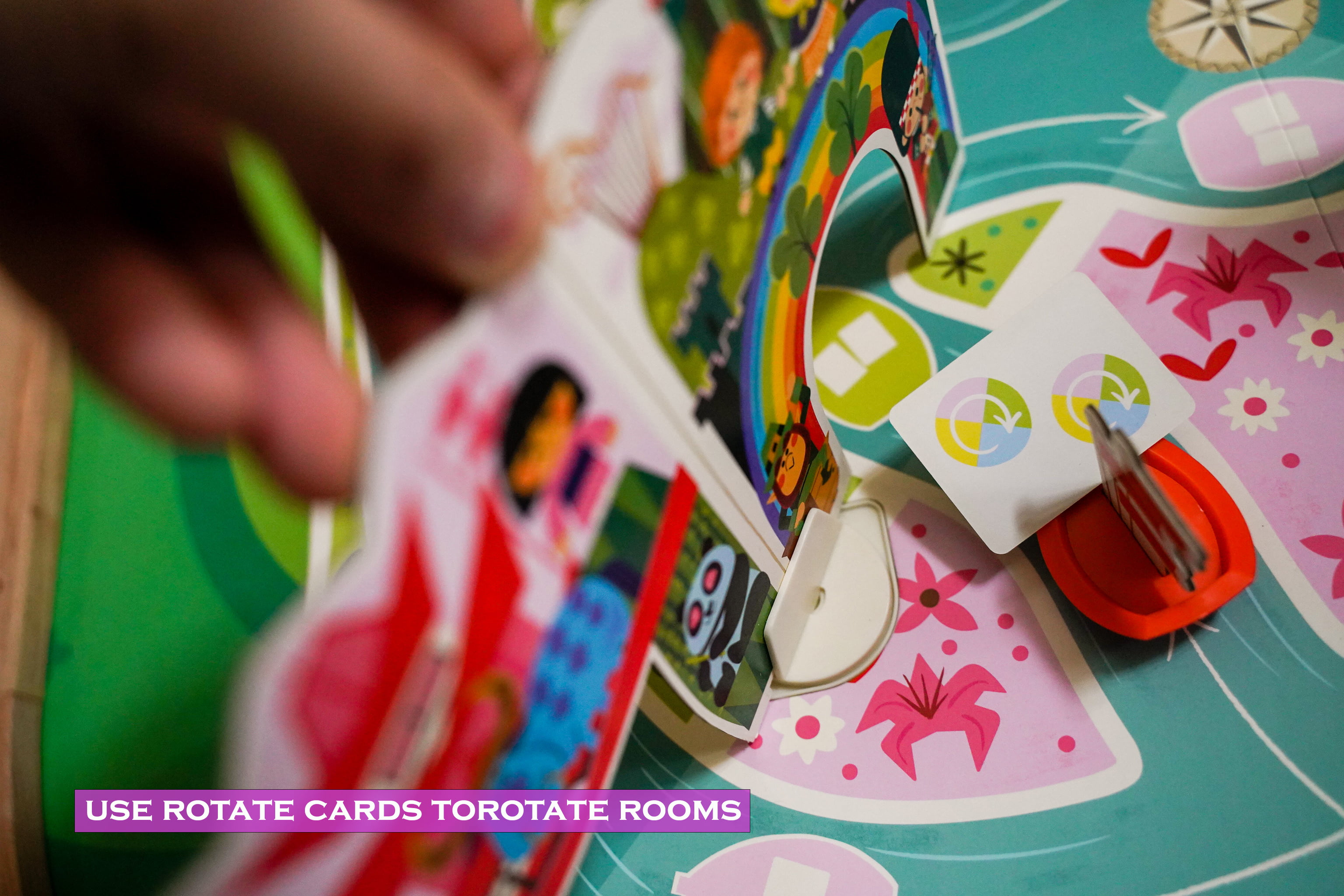 On your turn you must move your boat one space in the direction of the stream. You then collect a number of cards listed on that spot. Now you can try to match any cards in your hand to the images in the quadrant you are in. If done so correctly, place them in your team score pile. You may also use a rotation card to rotate a room wall, possibly bringing an image into your quadrant for you to score.