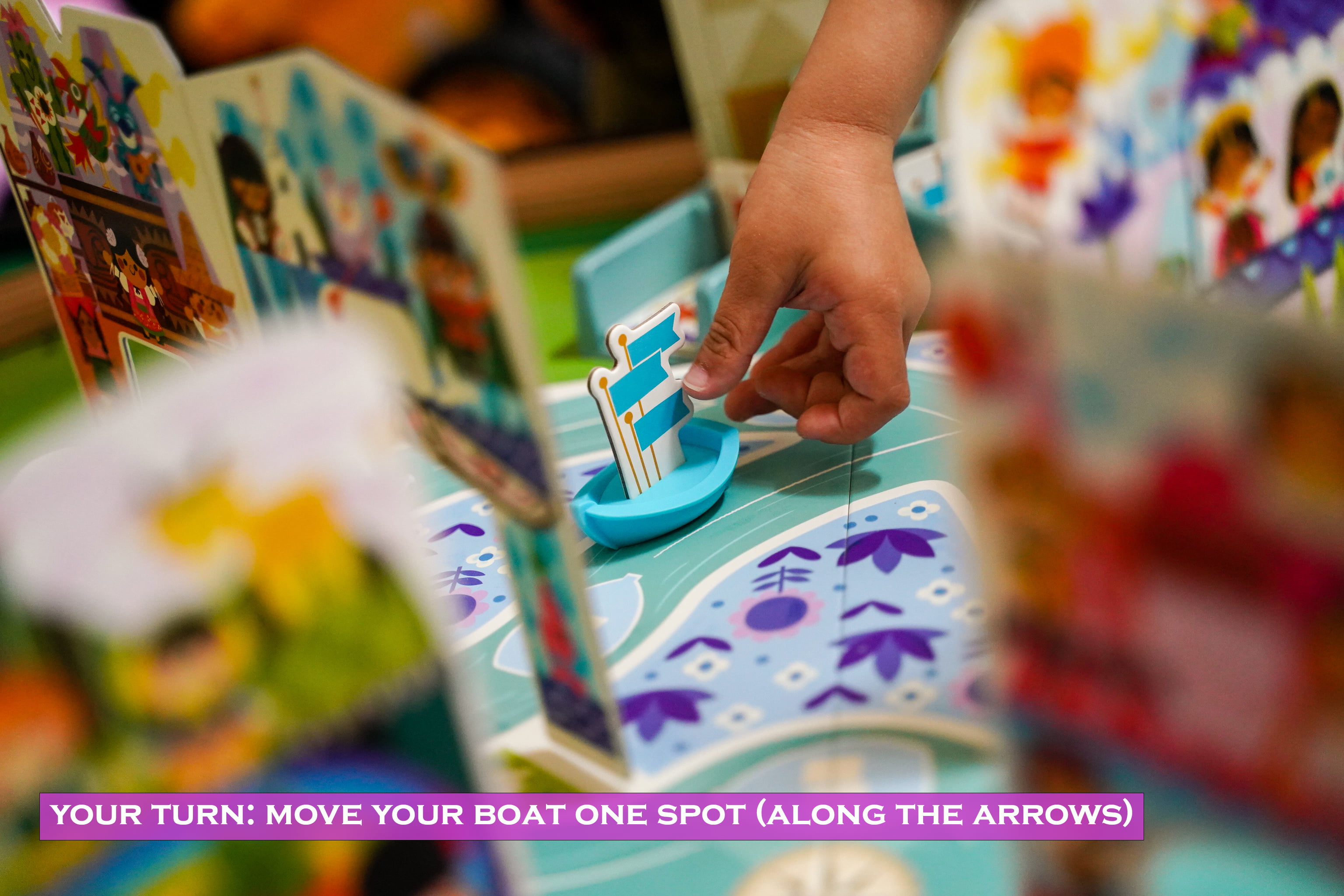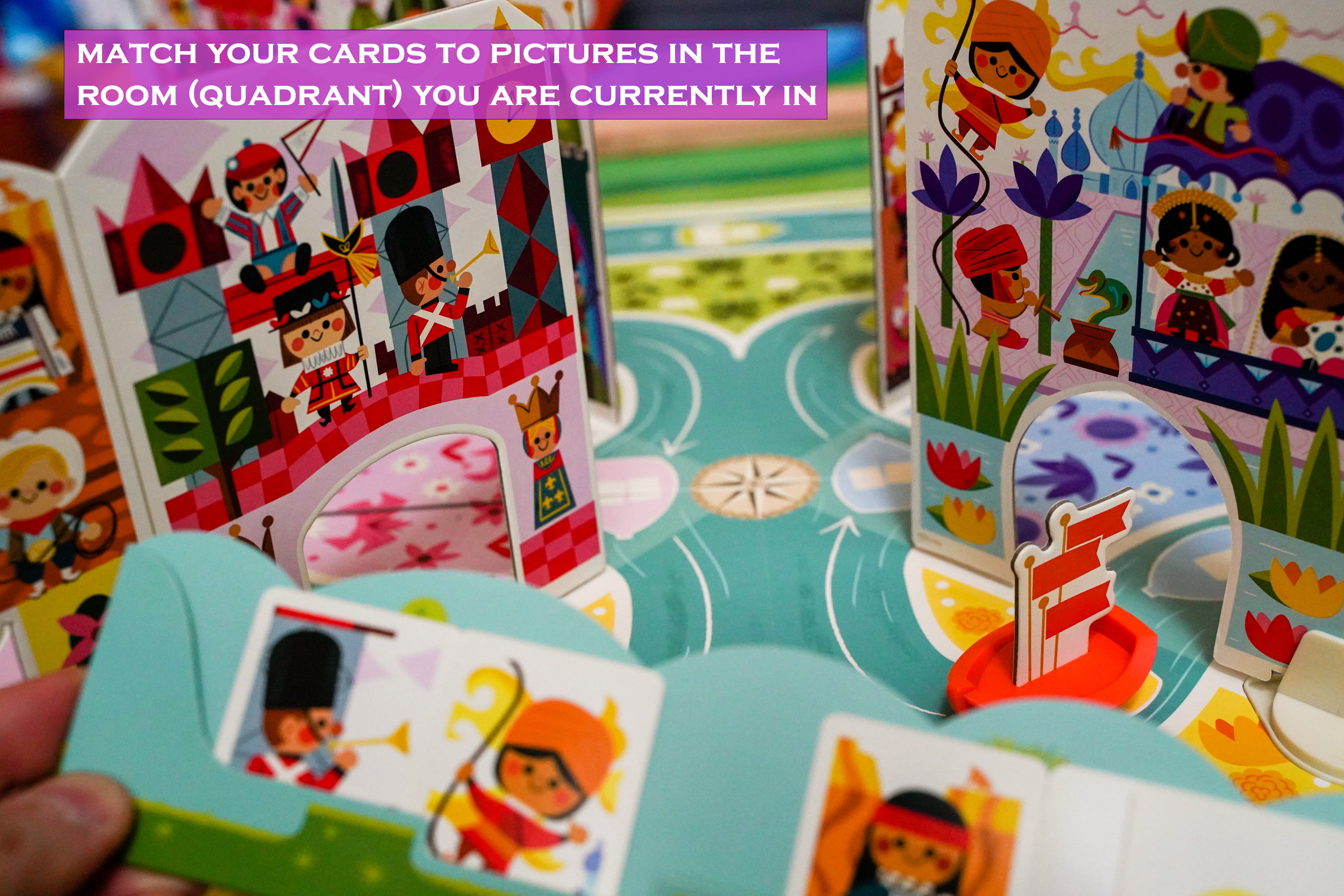The game is split into two teams each taking one boat. As the game says, if you have more than two players, share a boat, just like the actual ride! you ultimate goal is to match images on cards to images on the walls in the different rooms. the walls create 4 quadrants and you can match any image in the quadrant you currently reside in.