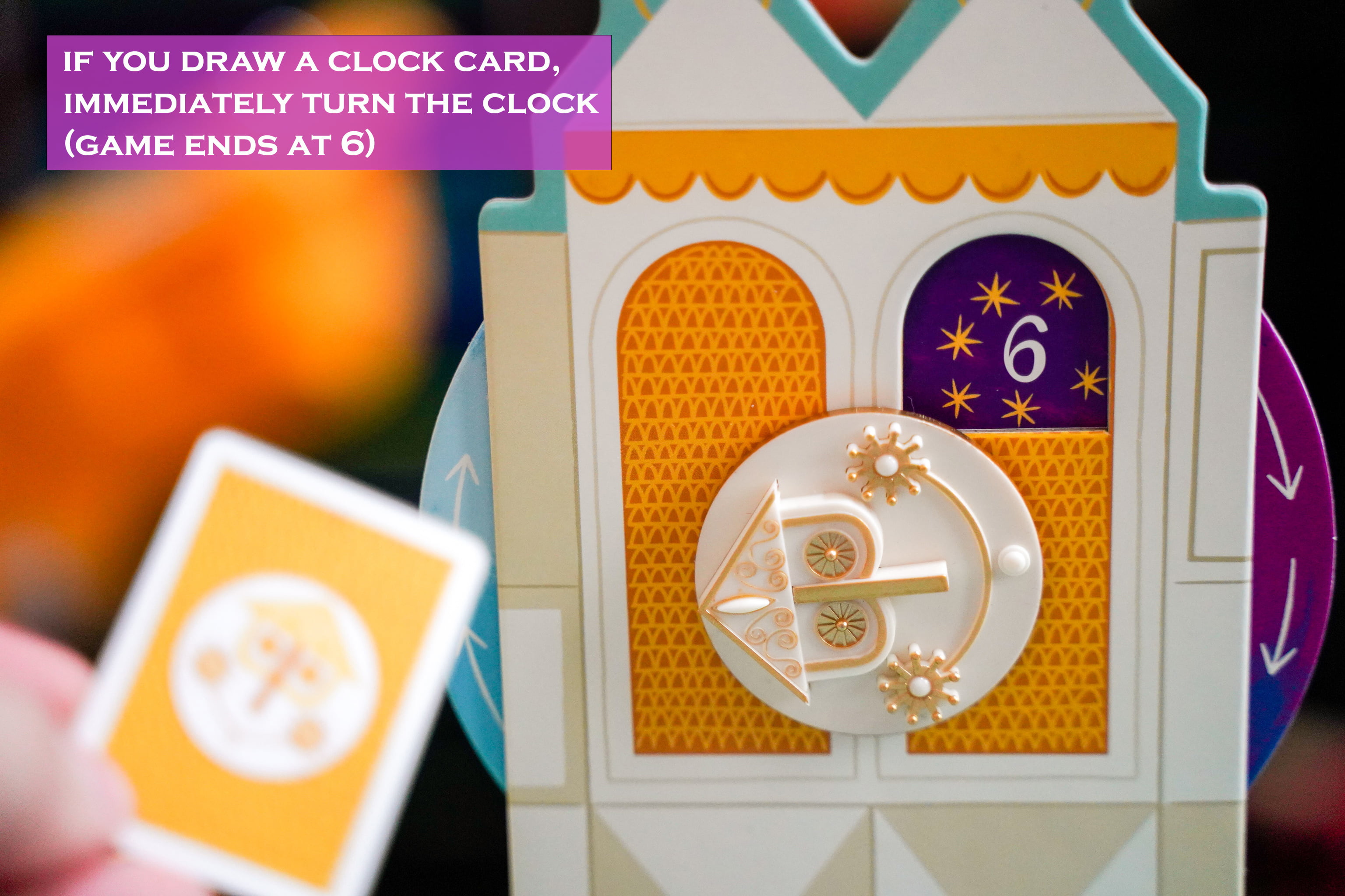 If you draw a clock card you turn the clock dial one rotation. The number increases and the game ends when it reaches 6 (night time). You can play until 5 for a shorter game or 7 for a longer game. When the game ends, the team with the most completed cards wins. You can also play as a team in a variant that has you combine your cards and try to achieve a certain number of cards before game end.